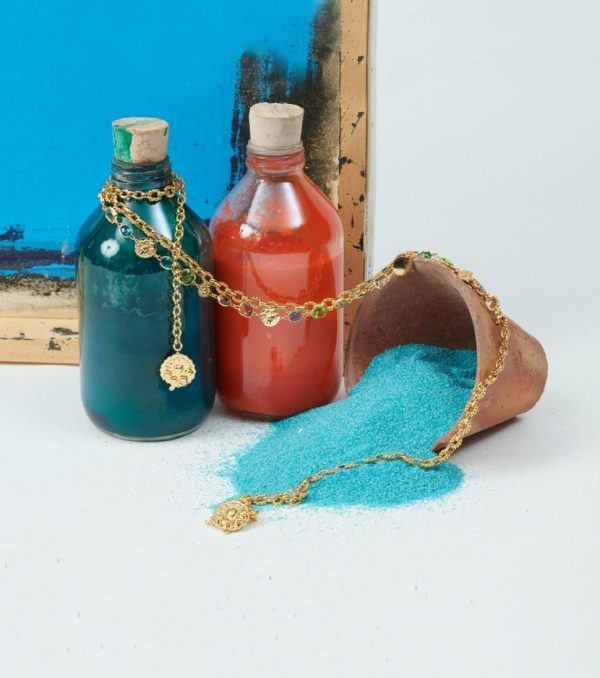 - Détails de pierres de verre de différentes couleurs et médaillon Fleur d’Arles.