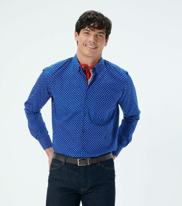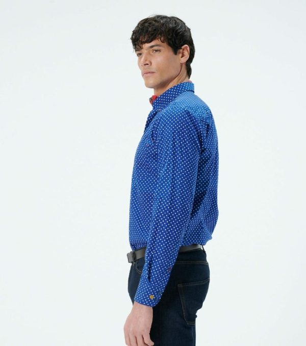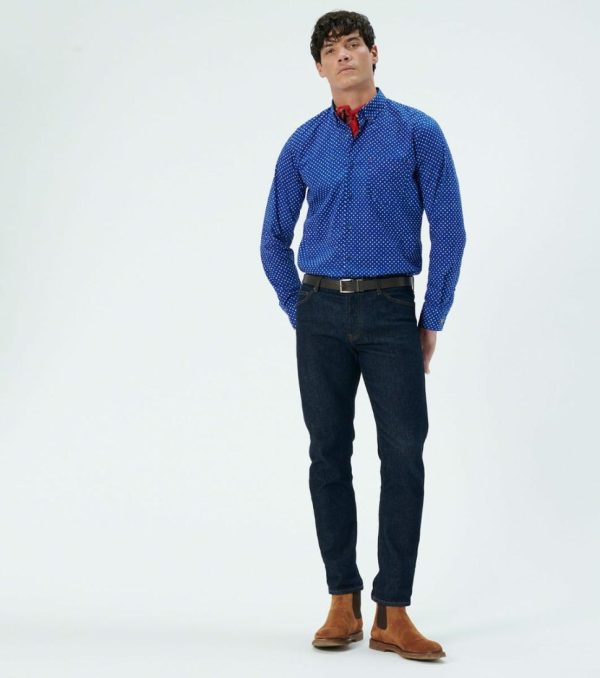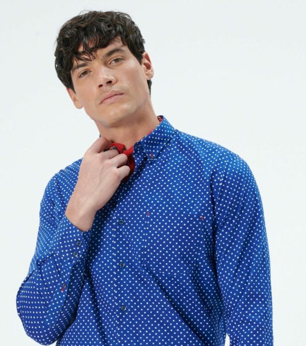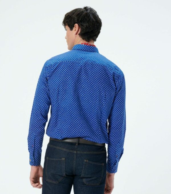 - Détails de fil rouge au niveau des boutons du col, des pattes poignets, et en haut de la poche